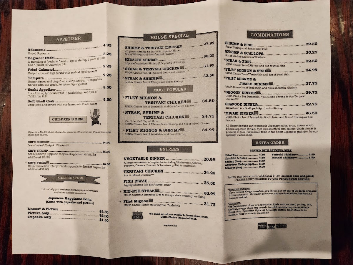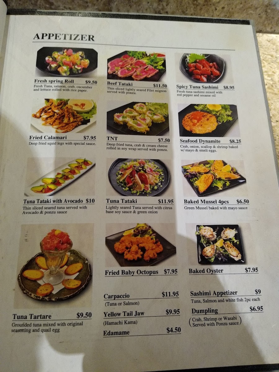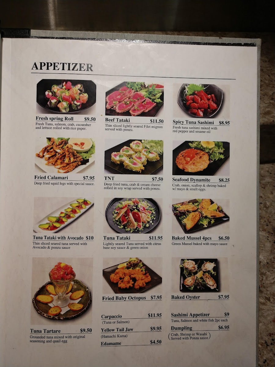 In addition to sushi, the menu features hibachi-style entrees such as Steak and Shrimp Hibachi and Filet Mignon with Shrimp accompanied by extra vegetables. Appetizers include options like Edamame, Shrimp Tempura, TNT Appetizer, and Asari Miso Soup, providing light starters suitable for casual dining. Soups such as Mushroom Soup are also available.