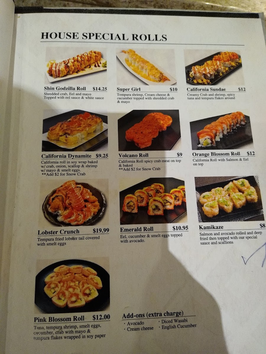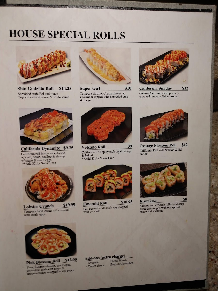 The menu at Miyabi Augusta offers a variety of Japanese cuisine items organized into several key categories. Visitors can explore a selection of house special rolls, which feature combinations like shrimp tempura with tuna, salmon, and crab meat, or rolls topped with a variety of fresh fish including tuna, white fish, salmon, yellowtail, shrimp, and avocado. Classic rolls include options such as Alaskan Roll, California Roll, and vegetable-based Garden Roll, with prices clearly indicated.