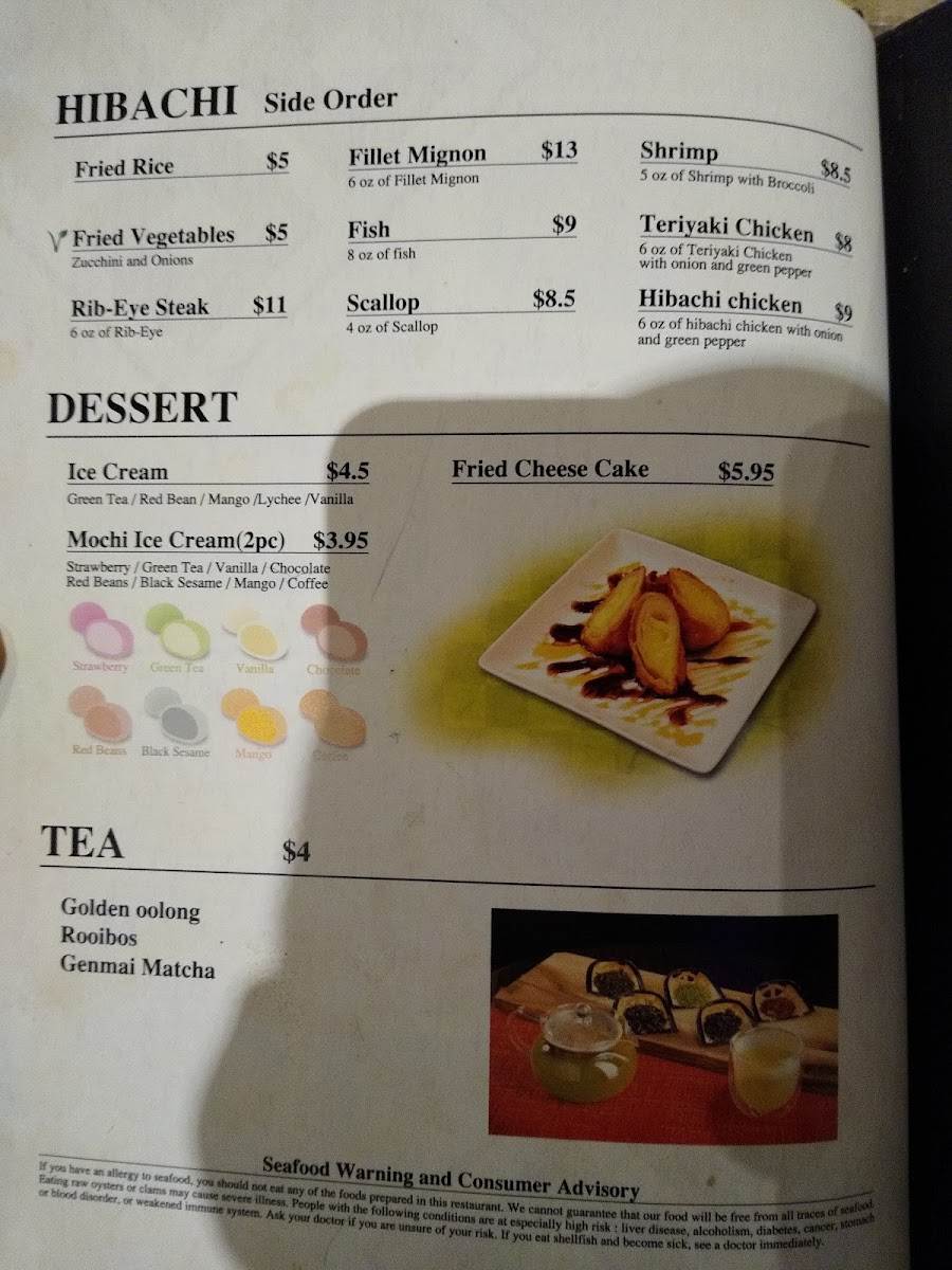 Beverages include hot green tea and other traditional drinks, complementing the overall food offerings. Desserts like Birthday Cake are listed on the menu to complete a meal.